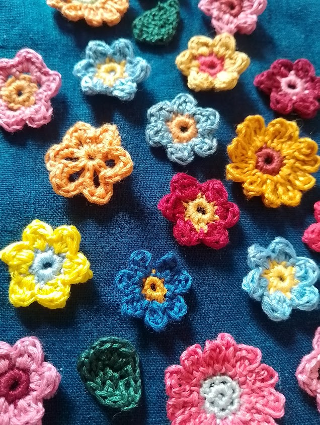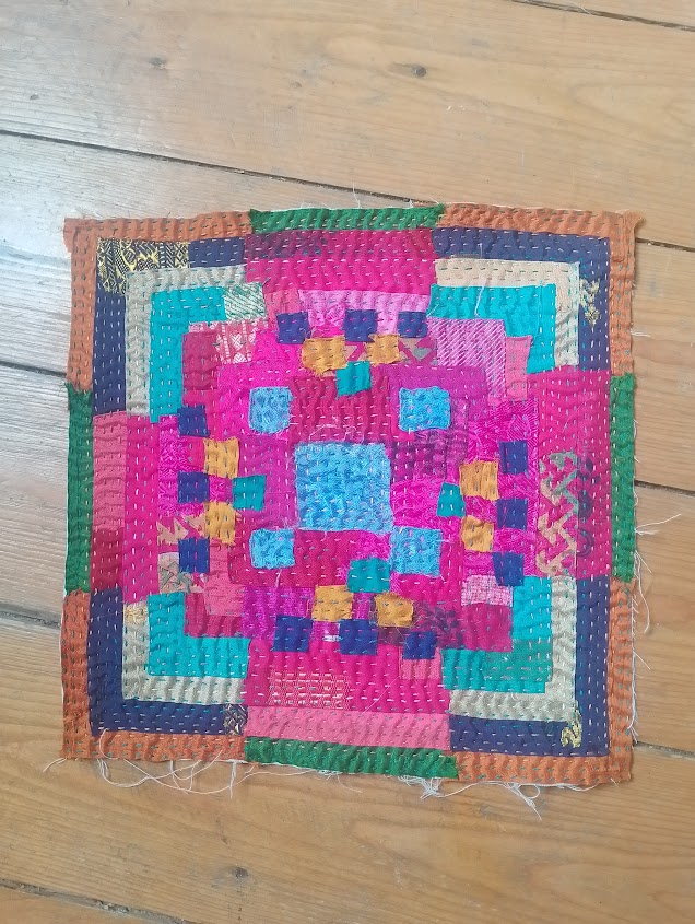 Other little things I’ve been up to include these tiny crochet flowers for a spring display in town; making a much needed pin cushion from a charity shop egg cup (/shot glass??); and some more Siddhi Study Stitching
